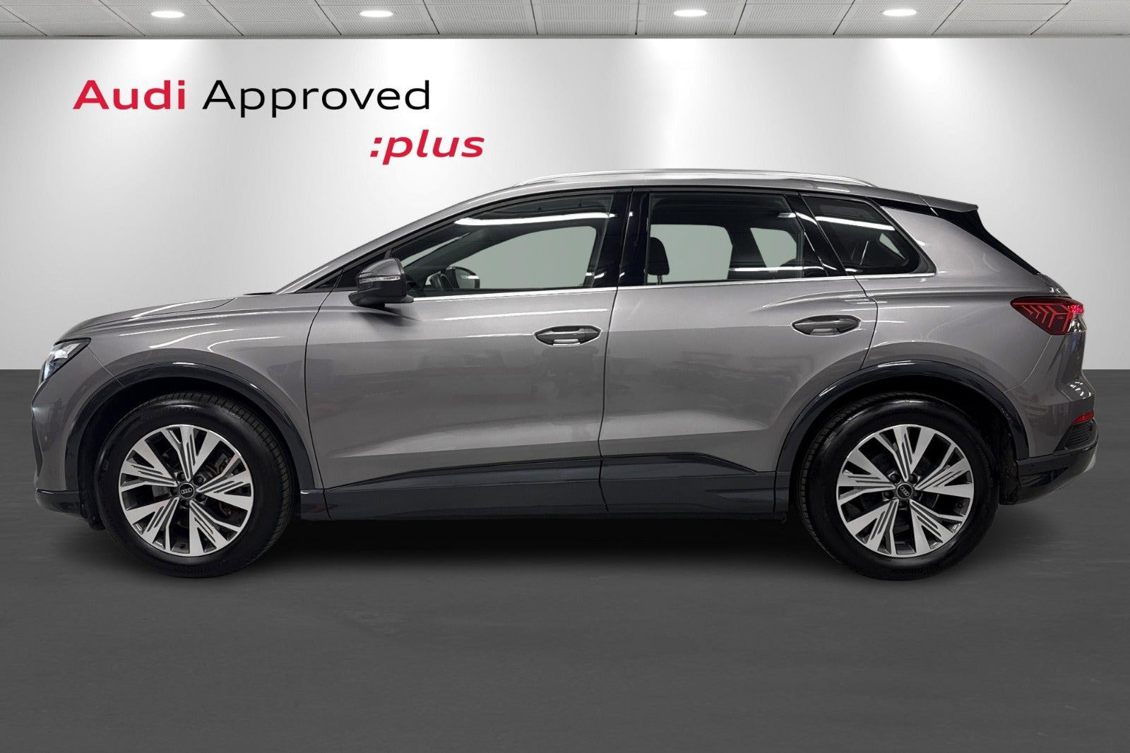 Audi Q4 e-tron Progress i Tyfongrå metallak – en moderne, fuldelektrisk premium-SUV med både komfort, stil og masser af udstyr.
