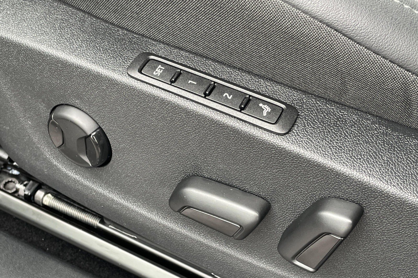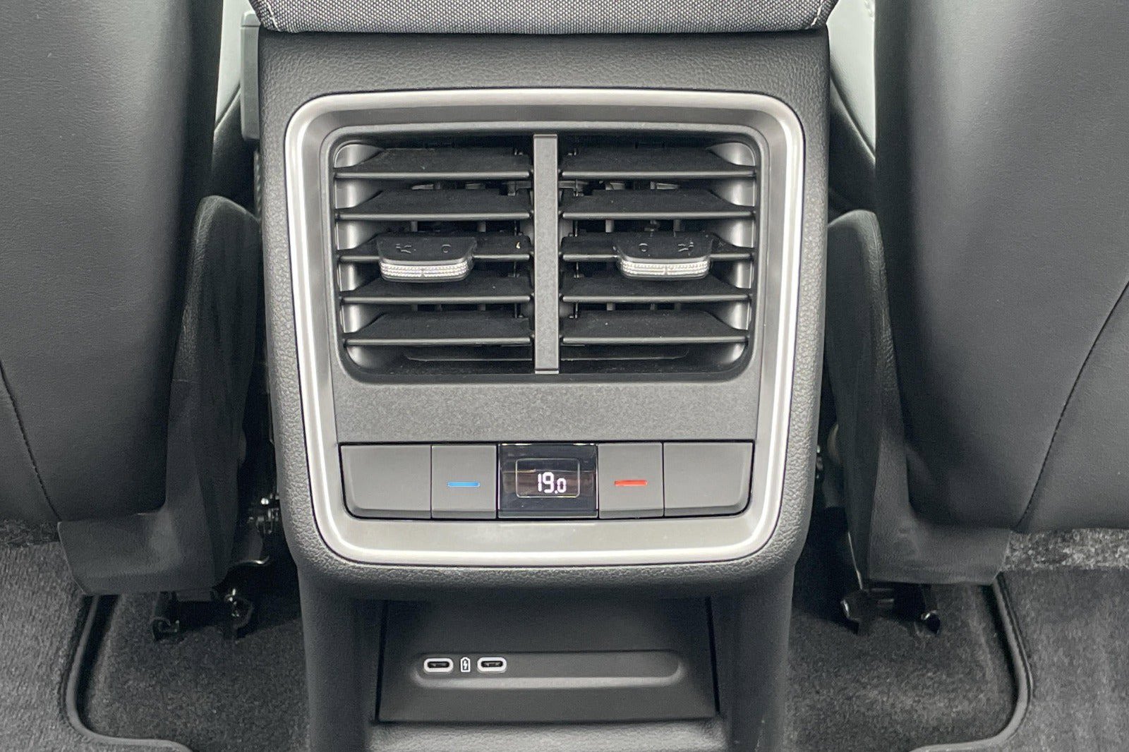 - Grå stofkabine med kunstlæder på bagsiden af forsæderne